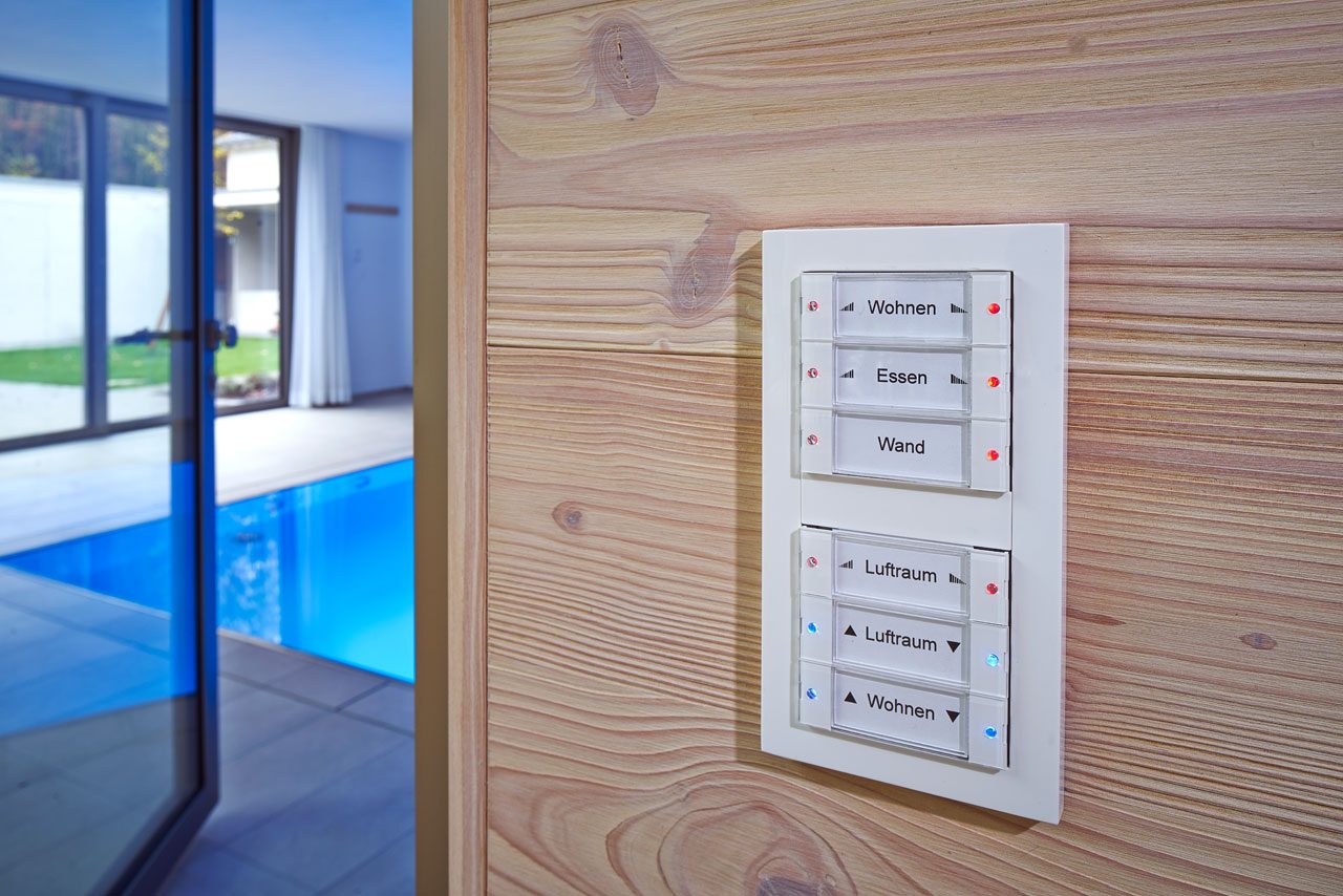 Energieeffizienz war ein zentrales Thema für die Bauherren. Das Haus ist nach KfW 55 Standard gebaut, das heißt es verbraucht nur 55% der Energie, das ein Haus nach der aktuellen Energieeinsparverordnung maximal benötigen darf. Dies ließ sich unter anderem realisieren durch eine Kombination aus leistungsstarkem Wärmedämmverbundsystem, dreifachverglasten Fenstern mit einem U-Wert von 0,7 W/m2K und Solarthermie. „Dies ergänzte sich ideal mit einem KNX System als Basis für die intelligente Gebäudesteuerung“, davon ist der Bauherr überzeugt. „Wir haben mit der Vernetzung erst einmal die Grundlage geschaffen und wichtige Basisfunktionen umgesetzt, später können diese nach Bedarf erweitert werden.“ Insbesondere die Jalousiesteuerung und Heizungsregelung auf konventionellem Weg wären ein riesiger Rückschritt für die Energieeffizienz gewesen.